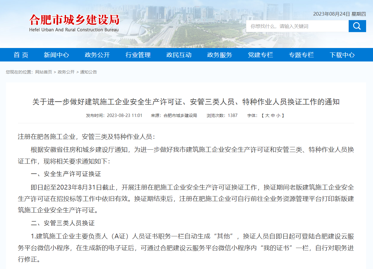 即日起至2023年8月31日截止,開(kāi)展注冊(cè)在肥施工企業(yè)安全生產(chǎn)許可證換證工作,換證期間老版建筑施工企業(yè)安全生產(chǎn)許可證在招投標(biāo)等工作中依舊有效。換證期結(jié)束后,注冊(cè)在肥施工企業(yè)可自行前往全業(yè)務(wù)資源管理平臺(tái)打印新版建筑施工企業(yè)安全生產(chǎn)許可證。