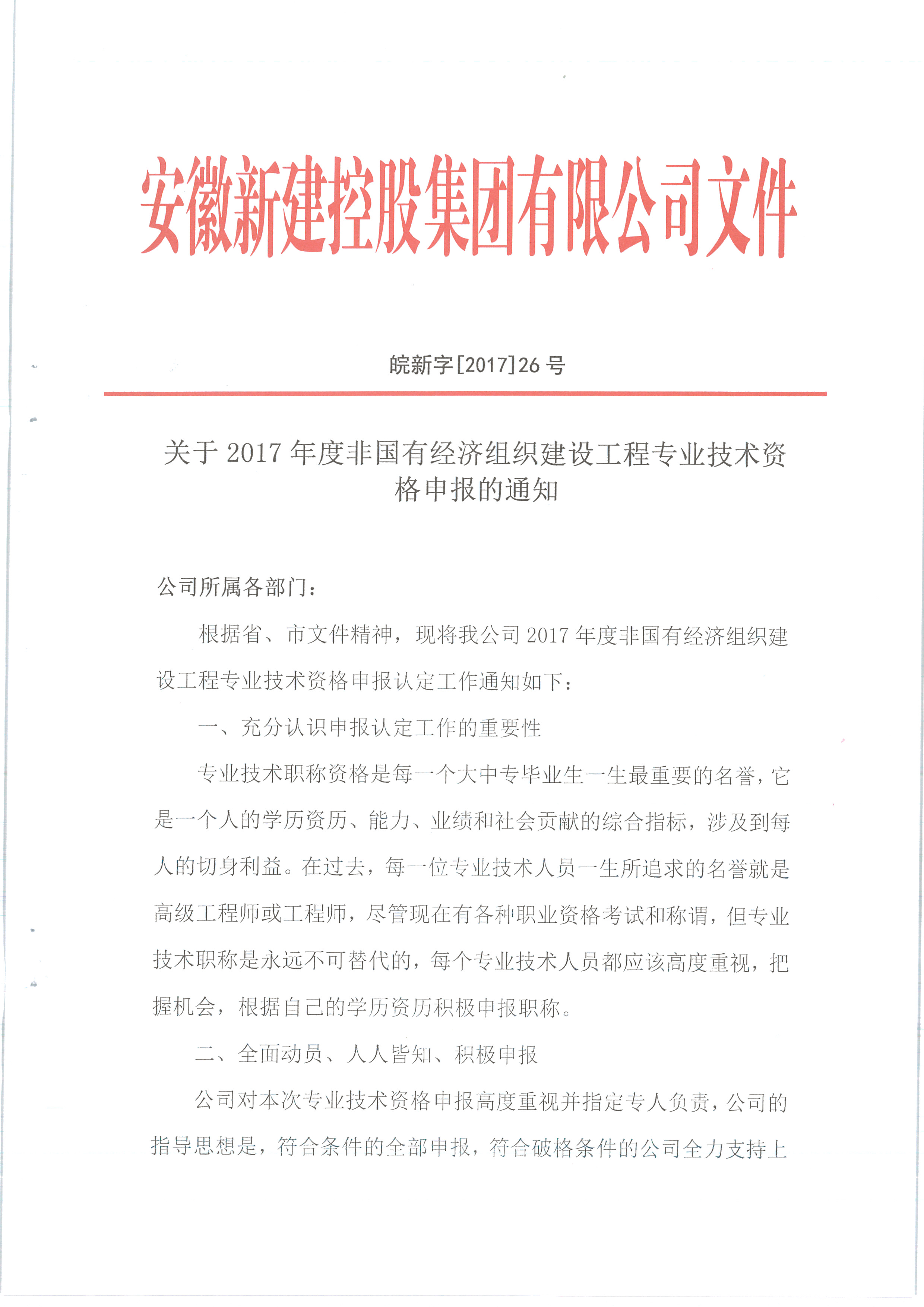 關(guān)于2017年度非國有經(jīng)濟(jì)組織建設(shè)工程專業(yè)技術(shù)資格申報的通知