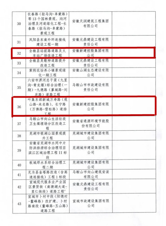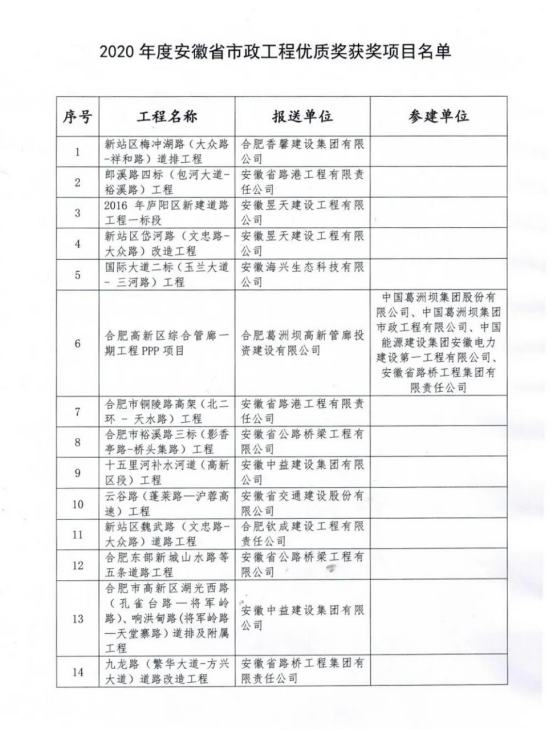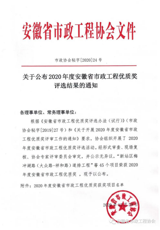2020年12月29日,根據(jù)《安徽省市政工程優(yōu)質獎評選辦法(試行)》(市政協(xié)會秘字【2019】27號)和《關于開展2020年度安徽省市政工程優(yōu)質獎評審工作的通知》要求,在協(xié)會組織開展評選活動中,經(jīng)形式審查、現(xiàn)場復核、專家評審委員會審定,由安徽新建控股集團有限公司施工的全椒縣站前路道路及火車站廣場改造工程、岳西縣店前濱河新區(qū)店前河綜合治理建設項目3標段、葉集東部新城萬壽路(觀山路-未名路)、長寧路(萬佛路-雪松路)道排工程,三項工程榮獲“2020年度安徽省市政工程優(yōu)質獎”!