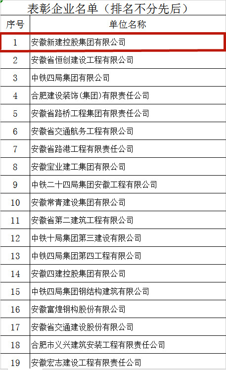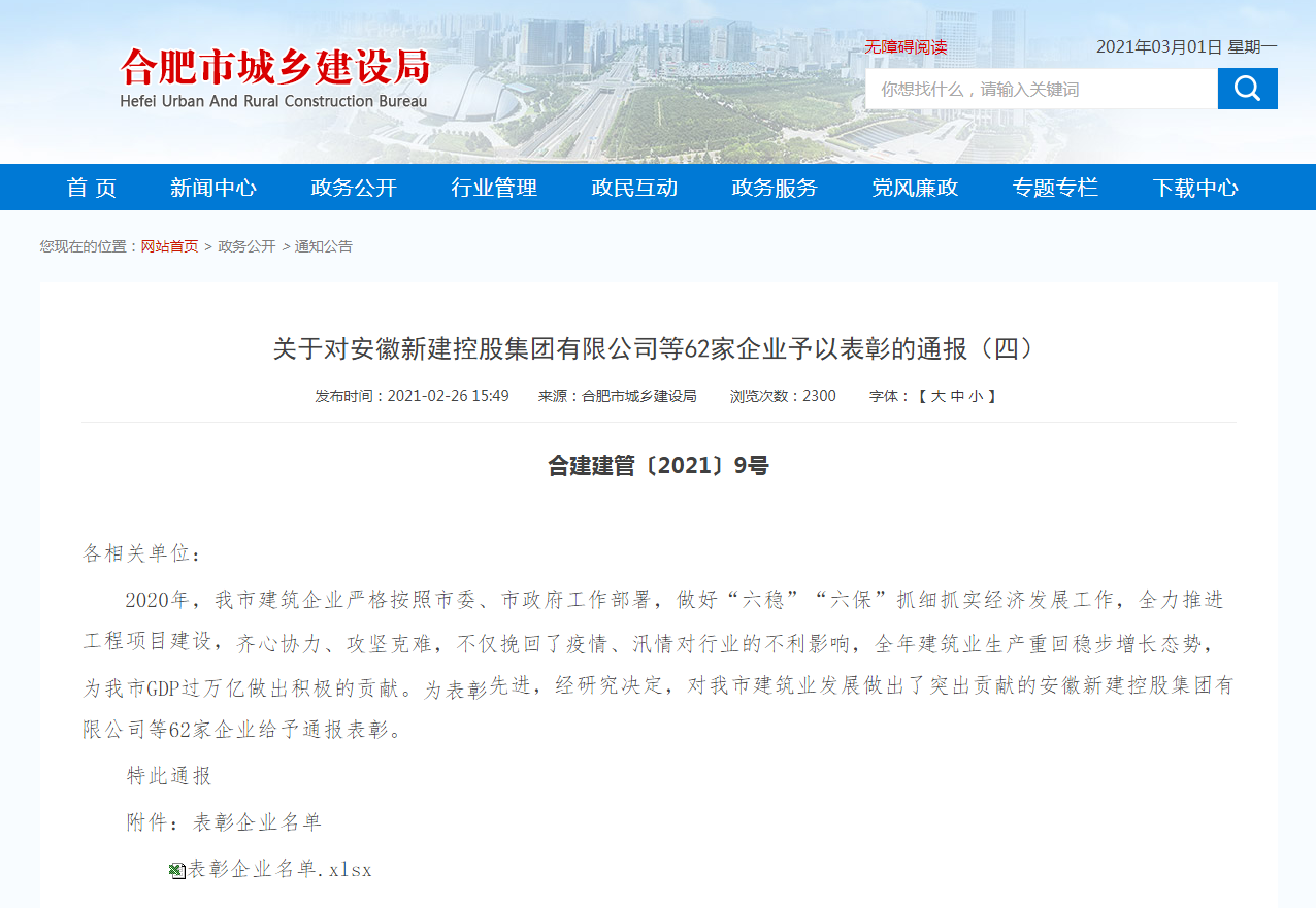 2月26日,合肥市城鄉(xiāng)建設局印發(fā)《關(guān)于對安徽新建控股集團有限公司等62家企業(yè)予以表彰的通報(四)》(合建建管[2021]9號)紅頭文件,對安徽新建控股集團有限公司等62家企業(yè)在2020年面對疫情、汛期的不利影響,全力推進工程項目建設,為我市GDP過萬億做出的積極貢獻進行通報表彰,安徽新建控股集團有限公司在該批次表彰中名列榜首。