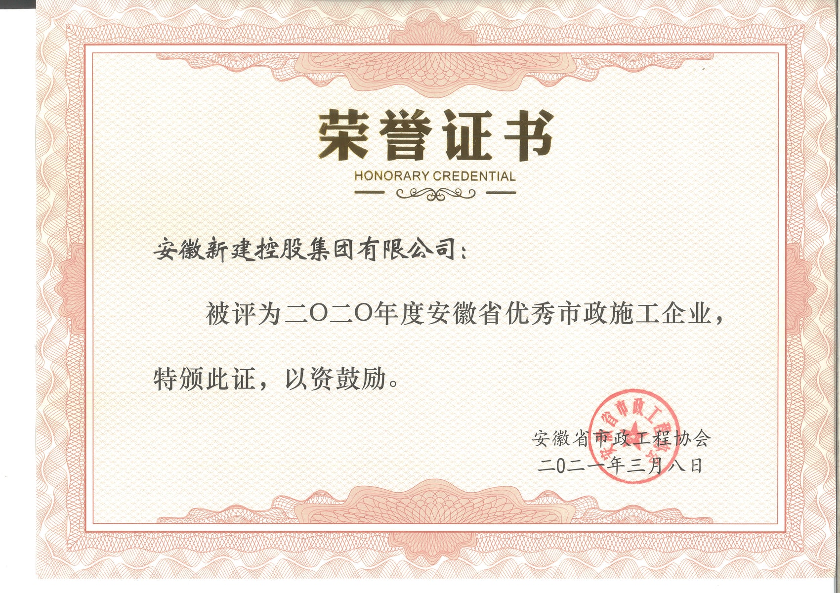 安徽新建控股集團(tuán)有限公司榮獲2020年度“安徽省優(yōu)秀市政施工企業(yè)”榮譽(yù)稱號(hào)。