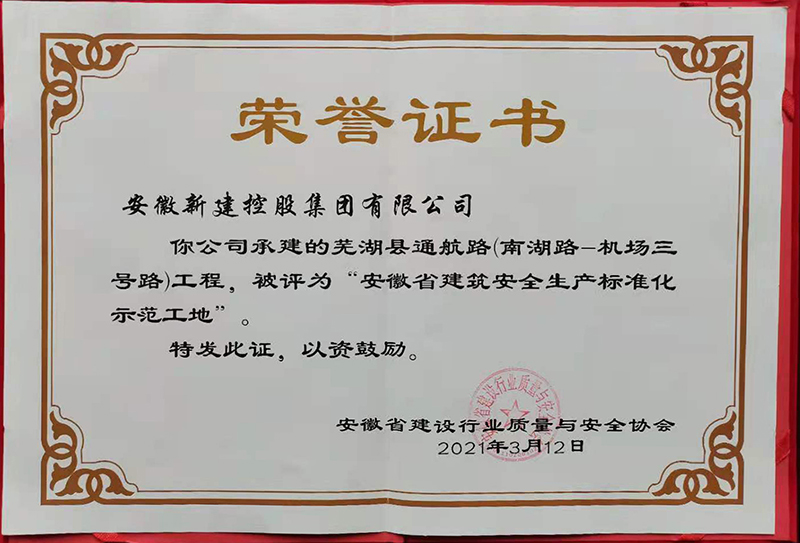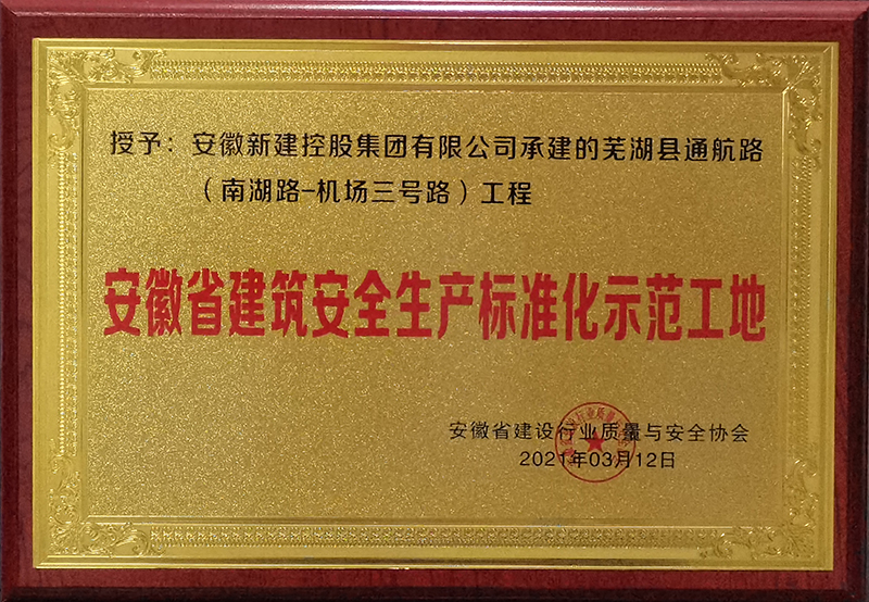 日前,安徽省建設行業(yè)安全協(xié)會公告2020年度第四批安徽省建筑安全生產(chǎn)標準化工地名單,由集團公司承建的蕪湖縣通航(南湖路-機場三號路)工程榮獲”安徽省建筑安全生產(chǎn)標準化示范工地”稱號。
