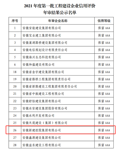 近日,中國施工企業(yè)管理協(xié)會發(fā)布關(guān)于2021年度第一批工程建設(shè)企業(yè)信用評價(jià)結(jié)果的公示,安徽新建控股集團(tuán)有限公司憑借良好的生產(chǎn)經(jīng)營業(yè)績、健全的管理體系以及規(guī)范的誠信建設(shè)成果,順利通過2021年社會信用評價(jià)“AAA”級年審認(rèn)定。