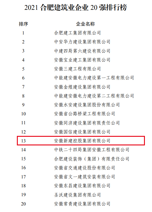 會上發(fā)布了2021合肥企業(yè)50強(qiáng)、2021合肥制造業(yè)企業(yè)30強(qiáng)、2021合肥服務(wù)業(yè)企業(yè)20強(qiáng)、2021合肥建筑業(yè)企業(yè)20強(qiáng)以及2021合肥農(nóng)業(yè)企業(yè)20強(qiáng)榜單。安徽新建控股集團(tuán)位居2021合肥建筑業(yè)企業(yè)20強(qiáng)第13位。
