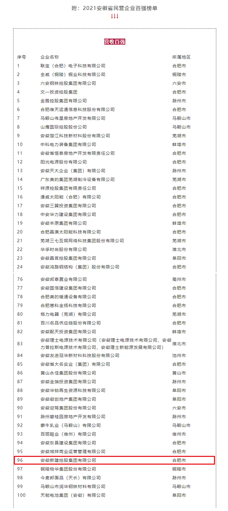 10月21日上午,由安徽省發(fā)展民營經(jīng)濟領(lǐng)導(dǎo)小組主辦,安徽省工商業(yè)聯(lián)合會、省經(jīng)濟和信息化廳、省市場監(jiān)督管理局承辦的2021安徽省民營企業(yè)百強發(fā)布會,在阜陽市隆重舉行。安徽新建控股集團位列“2021安徽省民營企業(yè)100強”營收榜單第96位,這也是安徽新建控股集團自2019年以來連續(xù)第三次進入安徽省民營企業(yè)百強榜單,充分體現(xiàn)安徽新建控股集團不斷進階的綜合實力。