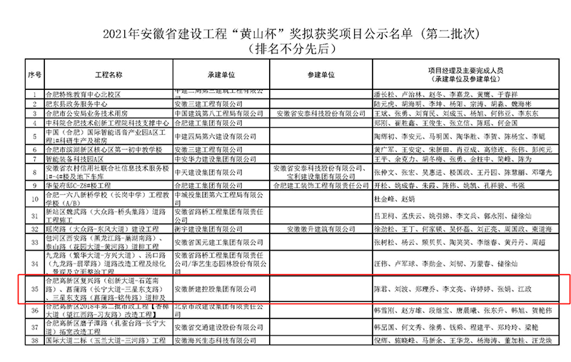 作為安徽施工企業(yè)中成立較早的民營企業(yè),多年來,安徽新建控股集團始終堅持以誠信為本,以質(zhì)創(chuàng)譽,先后多次獲得安徽優(yōu)秀建筑企業(yè),合肥市政行業(yè)優(yōu)秀企業(yè)、AAA級信用企業(yè)、安徽省建筑施工安全標準示范單位等多個獎項和榮譽。此次榮獲“黃山杯”獎,是對公司施工質(zhì)量水平的充分肯定,公司將進一步加強在建項目質(zhì)量管理,推廣獲獎項目的先進經(jīng)驗和做法,創(chuàng)建更多的優(yōu)質(zhì)示范工程,不斷提升公司的核心競爭力。
