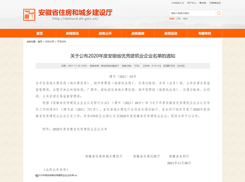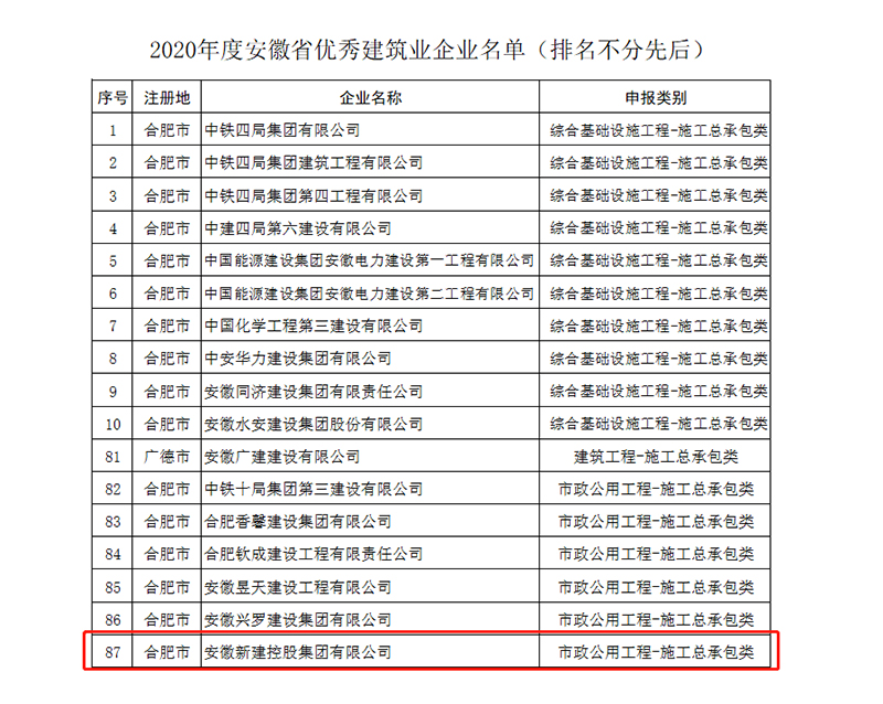11月30日,安徽省住房和城鄉(xiāng)建設(shè)廳網(wǎng)站發(fā)布《關(guān)于公布2020年度安徽省優(yōu)秀建筑業(yè)企業(yè)名單的通知》,安徽新建控股集團(tuán)獲評(píng)“2020年度安徽省優(yōu)秀建筑業(yè)企業(yè)”,殊榮實(shí)至名歸!成績可喜可賀!