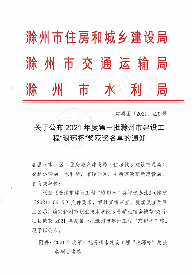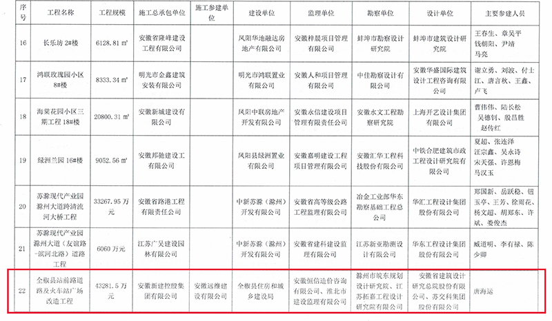 12月22日,安徽省滁州市住房和城鄉(xiāng)建設局、交通運輸局、水利局聯(lián)合印發(fā)《關(guān)于公布2021年度第一批滁州市建設工程“瑯琊杯”獲獎名單的通知》,安徽新建控股集團承建的全椒縣站前路道路及火車站廣場改造工程榜上有名。