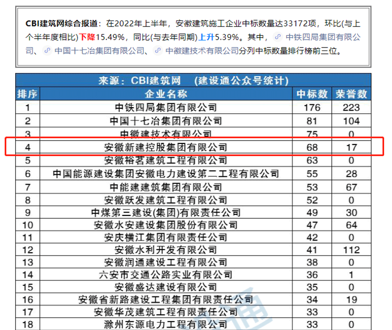 7月20日,CBI建筑網(wǎng)綜合報道發(fā)布《安徽2022上半年建企中標100強》,在2022年上半年,安徽建筑施工企業(yè)中標數(shù)量達33172項,環(huán)比(與上個半年度相比)下降15.49%,同比(與去年同期)上升5.39%。其中安徽新建控股集團有限公司位列中標數(shù)量排行榜第四,穩(wěn)居前位。