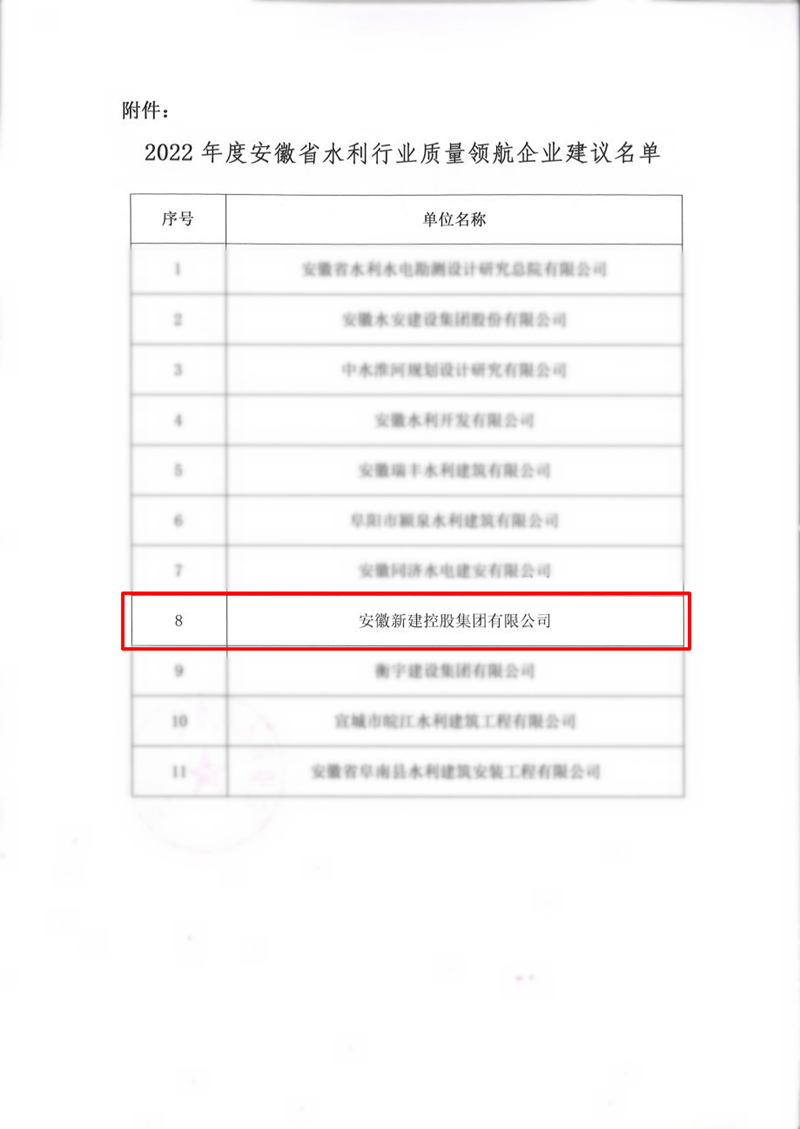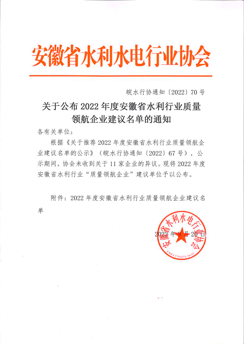 9月20日,安徽省水利水電行業(yè)協(xié)會(huì)發(fā)布《關(guān)于公布2022年度安徽省水利行業(yè)質(zhì)量領(lǐng)航企業(yè)建議名單的通知》,集團(tuán)公司獲評(píng)“安徽省水利行業(yè)質(zhì)量領(lǐng)航企業(yè)”,體現(xiàn)了行業(yè)協(xié)會(huì)對(duì)公司影響力、知名度和美譽(yù)度的進(jìn)一步認(rèn)可,也是企業(yè)綜合競(jìng)爭(zhēng)力的集中表現(xiàn)。
