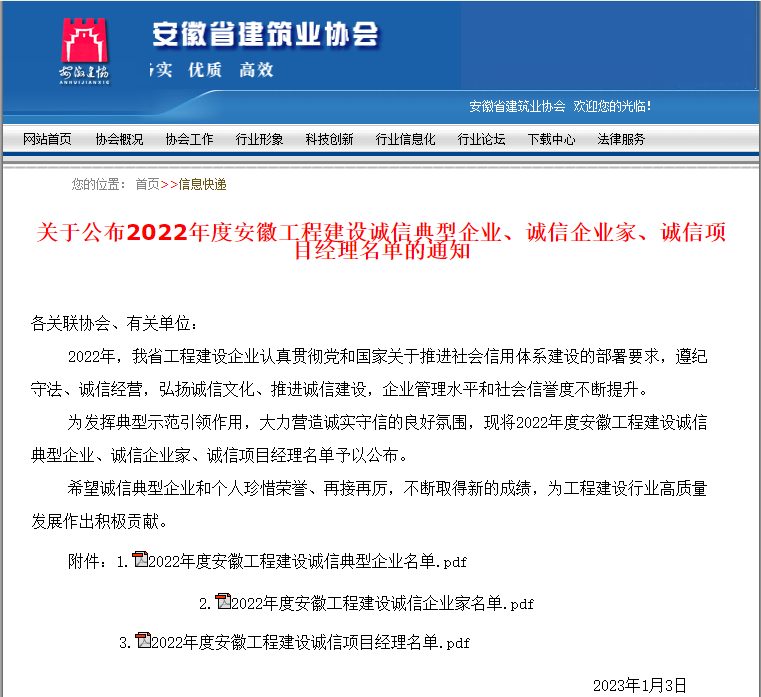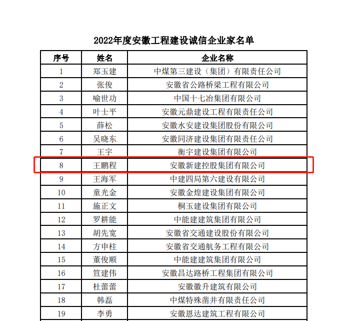 1月3日,安徽建筑業(yè)協(xié)會官網(wǎng)發(fā)布2022年度安徽工程建設(shè)誠信典型企業(yè)、誠信企業(yè)家、誠信項目經(jīng)理名單,安徽新建控股集團榮獲“2022年度安徽工程建設(shè)誠信典型企業(yè)”,公司總經(jīng)理王鵬程獲評“誠信企業(yè)家”,唐海運、張軻、鄭理喬分獲“誠信項目經(jīng)理”稱號。