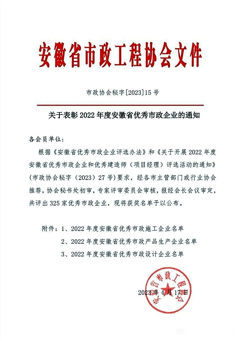 近日,根據(jù)安徽省市政工程協(xié)會(huì)《關(guān)于開(kāi)展2022年度安徽省優(yōu)秀市政施工企業(yè)和優(yōu)秀建造師(項(xiàng)目經(jīng)理》評(píng)選活動(dòng)的通知》和《安徽省優(yōu)秀市政施工企業(yè)評(píng)選辦法》、《安徽省市政施工企業(yè)優(yōu)秀項(xiàng)目經(jīng)理評(píng)選辦法》要求,經(jīng)專(zhuān)家評(píng)審委員會(huì)審核通過(guò)。