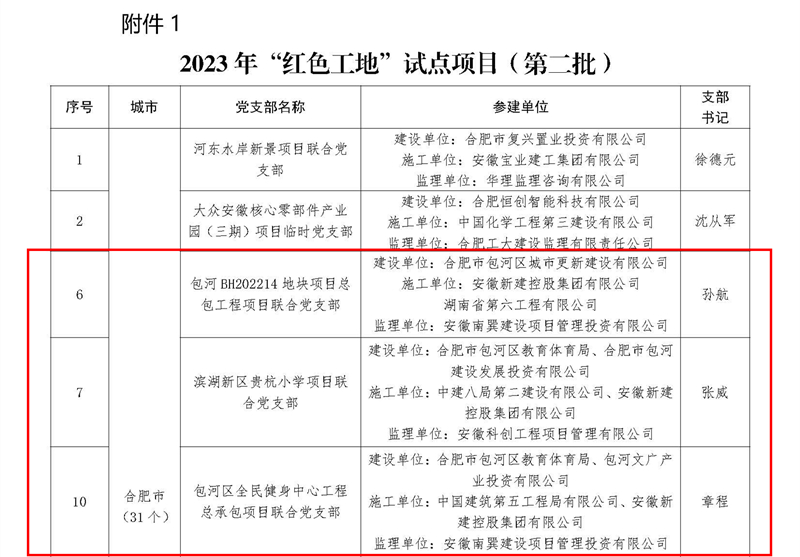 近日,安徽省住房和城鄉(xiāng)建設(shè)廳網(wǎng)站公布了2023年“四個工地”(第二批)試點項目的名單,集團公司承建項目濱湖新區(qū)貴杭小學(xué)、包河區(qū)全民健身中心工程總承包、包河BH202214地塊項目總包工程獲得“紅色工地”試點稱號,其中包河區(qū)全民健身中心工程總承包同時獲評“綠色工地”稱號。