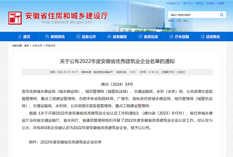 3月1日,安徽省住房和城鄉(xiāng)建設(shè)廳公布了“2022年度安徽省優(yōu)秀建筑業(yè)企業(yè)”名單,安徽新建控股集團(tuán)再次榮登榜單,榮獲“2022年度安徽省優(yōu)秀建筑業(yè)企業(yè)”稱號(hào)。
