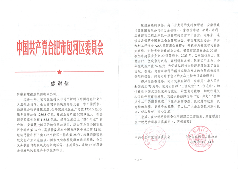 近日,安徽新建收到包河區(qū)委區(qū)政府發(fā)來的一封感謝信,對(duì)集團(tuán)公司2023年取得的矚目成績(jī)與雙方的合作成效以及公司對(duì)包河的關(guān)心支持致以誠(chéng)摯謝意!