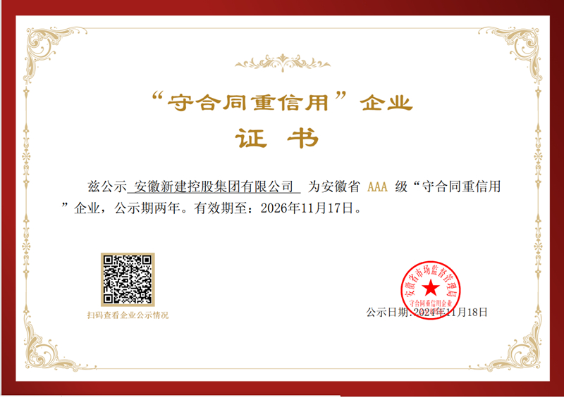 11月18日,安徽省市場監(jiān)督管理局正式公布關于“安徽省守合同重信用企業(yè)名單”,集團公司獲得頒發(fā)安徽省AAA級“守合同重信用”企業(yè)榮譽證書。