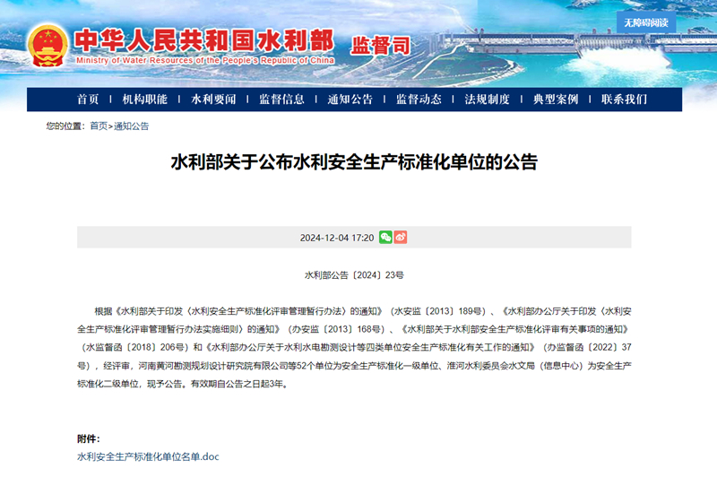 12月4日,水利部發(fā)布《關(guān)于公布水利安全生產(chǎn)標準化單位的公告》,經(jīng)評審,集團公司獲評水利安全生產(chǎn)標準化一級單位。該等級是體現(xiàn)水利生產(chǎn)經(jīng)營單位安全生產(chǎn)管理水平的重要標志,并作為業(yè)績考核、行業(yè)表彰、信用評級以及評價水利生產(chǎn)經(jīng)營單位參與水利市場競爭能力的重要參考依據(jù)。
