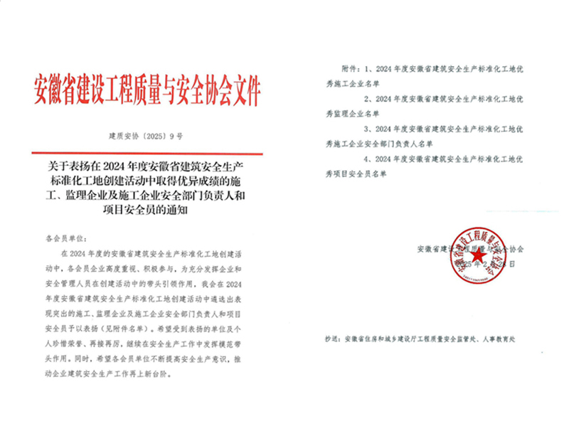 近日,安徽省建設工程質量與安全協(xié)會發(fā)布表揚通知,集團公司榮獲“安徽省建筑安全生產標準化工地優(yōu)秀施工企業(yè)”稱號,公司多名安全管理人員獲得表彰。