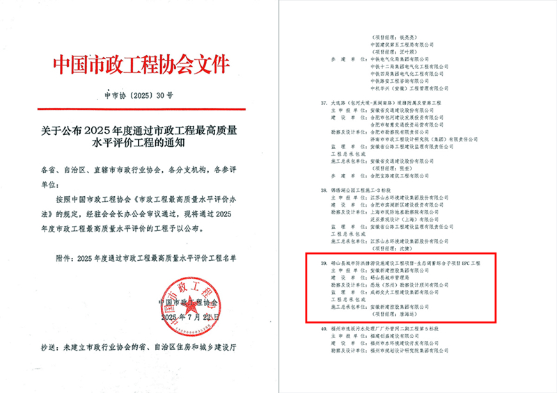 近日,中國(guó)市政工程協(xié)會(huì)發(fā)布《關(guān)于2025年度通過市政工程最高質(zhì)量水平評(píng)價(jià)工程的通知》,由集團(tuán)公司建設(shè)的碭山縣城市防洪排澇設(shè)施建設(shè)工程項(xiàng)目-生態(tài)調(diào)蓄綜合子項(xiàng)目EPC工程成功榮獲“2025年度市政工程最高質(zhì)量水平評(píng)價(jià)工程”這一市政工程行業(yè)最高榮譽(yù)。