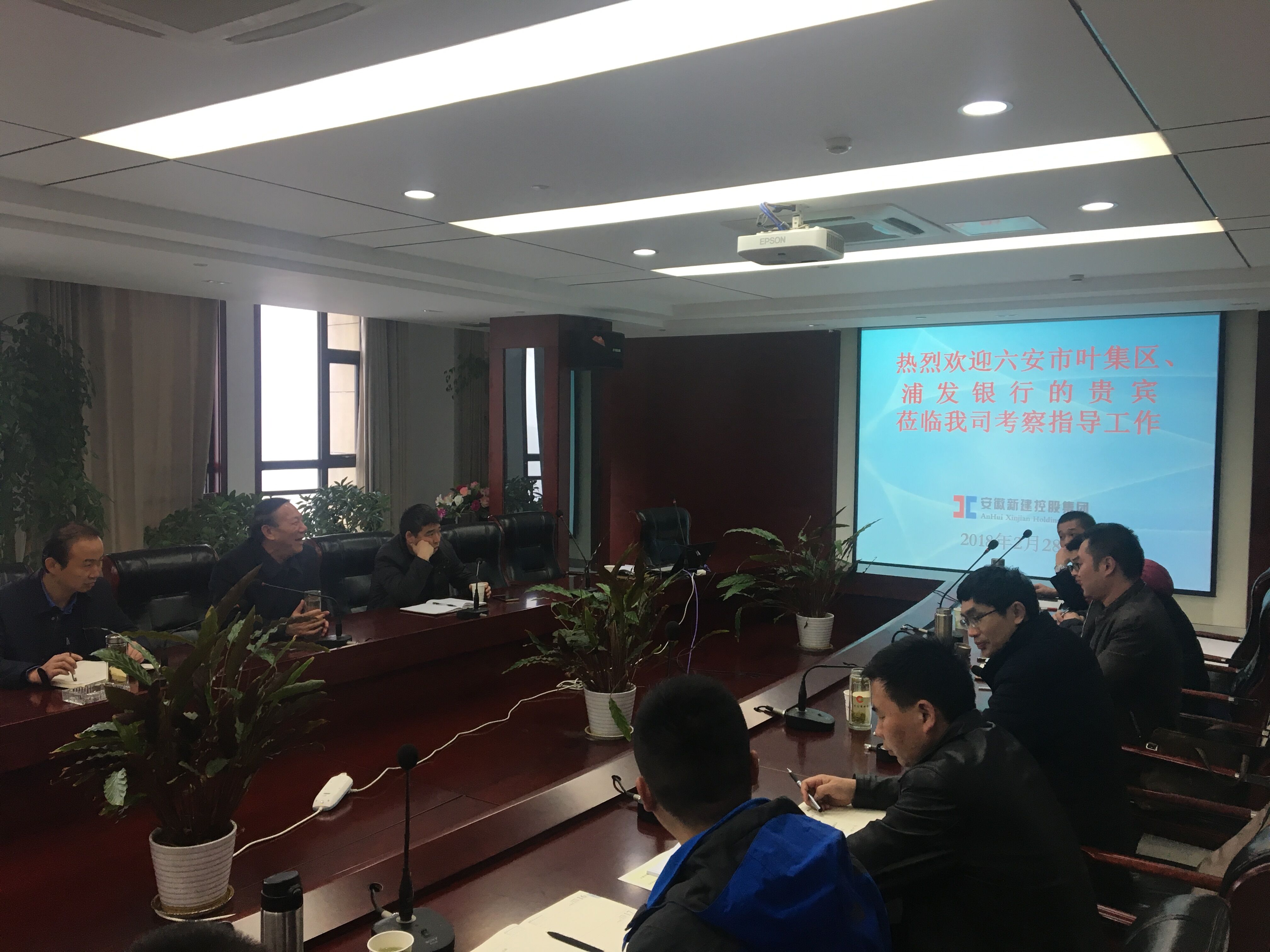 2018年8月28日上午,六安市葉集區(qū)財(cái)政局副局長、浦發(fā)銀行蕪湖分行熊赟副行長、六安市葉集建設(shè)投資經(jīng)營有限責(zé)任公司王磊董事長等一行來我公司洽談工程項(xiàng)目融資事宜,安徽新建控股集團(tuán)有限公司王杰英董事長及相關(guān)領(lǐng)導(dǎo)熱情接待。