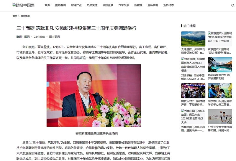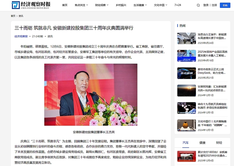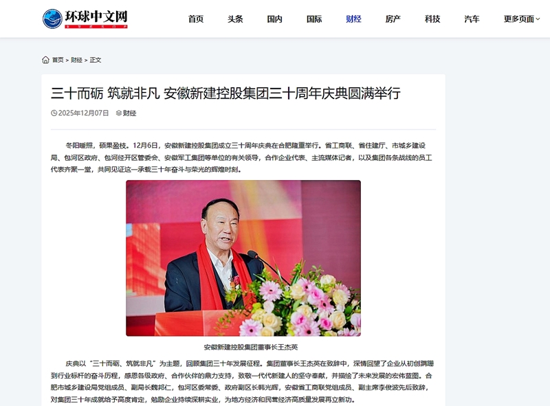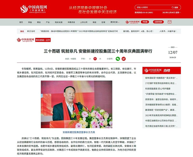 慶典以“三十而礪、筑就非凡”為主題,回顧集團(tuán)三十年發(fā)展征程。各大主流媒體CCTV中文網(wǎng)、中國經(jīng)濟(jì)新聞聯(lián)播、中國科創(chuàng)網(wǎng)、環(huán)球中文網(wǎng)、CCN中城網(wǎng)、財(cái)報(bào)中國網(wǎng)、經(jīng)濟(jì)觀察時(shí)報(bào)、中國商報(bào)網(wǎng)、安徽新聞在線等,紛紛對安徽新建控股集團(tuán)成立三十周年慶典活動(dòng)進(jìn)行了廣泛報(bào)道。這些報(bào)道不僅提升了集團(tuán)的社會(huì)知名度和美譽(yù)度,也為集團(tuán)未來的發(fā)展?fàn)I造了良好的輿論氛圍。