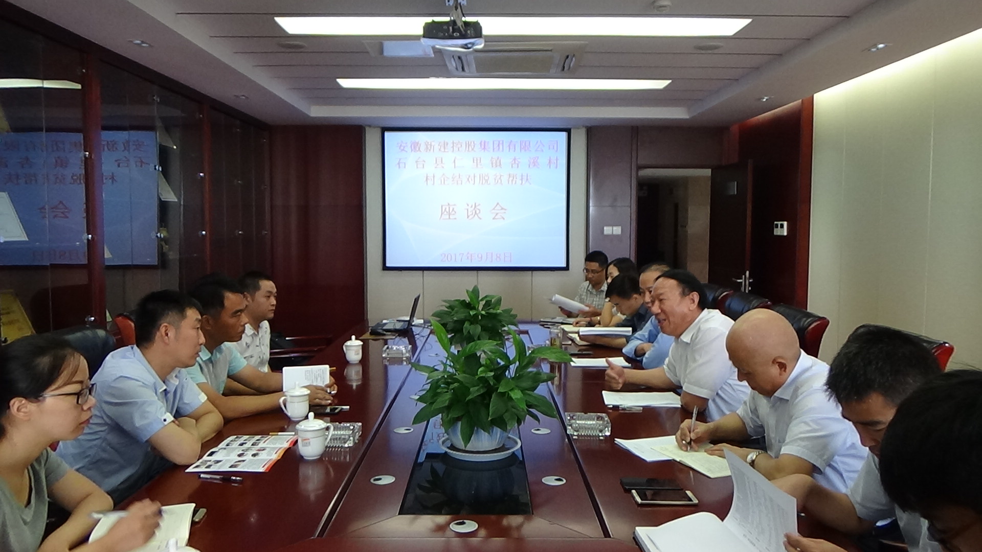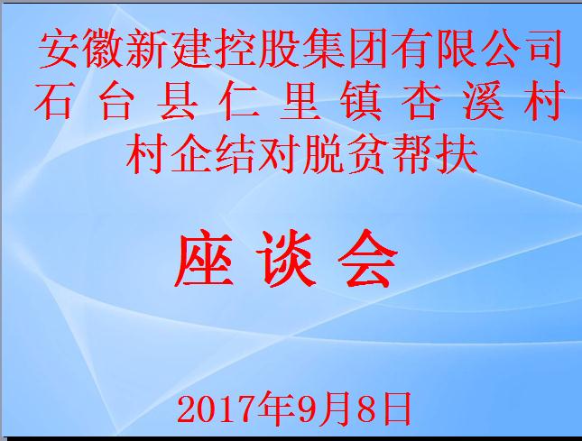 2017年9月8日,我公司村企結(jié)對脫貧幫扶對象石臺縣仁里鎮(zhèn)杏溪村的村委書記雷霆一行來我公司座談,安徽新建控股集團(tuán)有限公司董事長王杰英等相關(guān)領(lǐng)導(dǎo)參加了座談會,雷書記對杏溪村的脫貧情況進(jìn)行了詳細(xì)介紹,公司領(lǐng)導(dǎo)對杏溪村脫貧幫扶給出了初步計(jì)劃和方案,村企雙方對座談效果感到滿意。