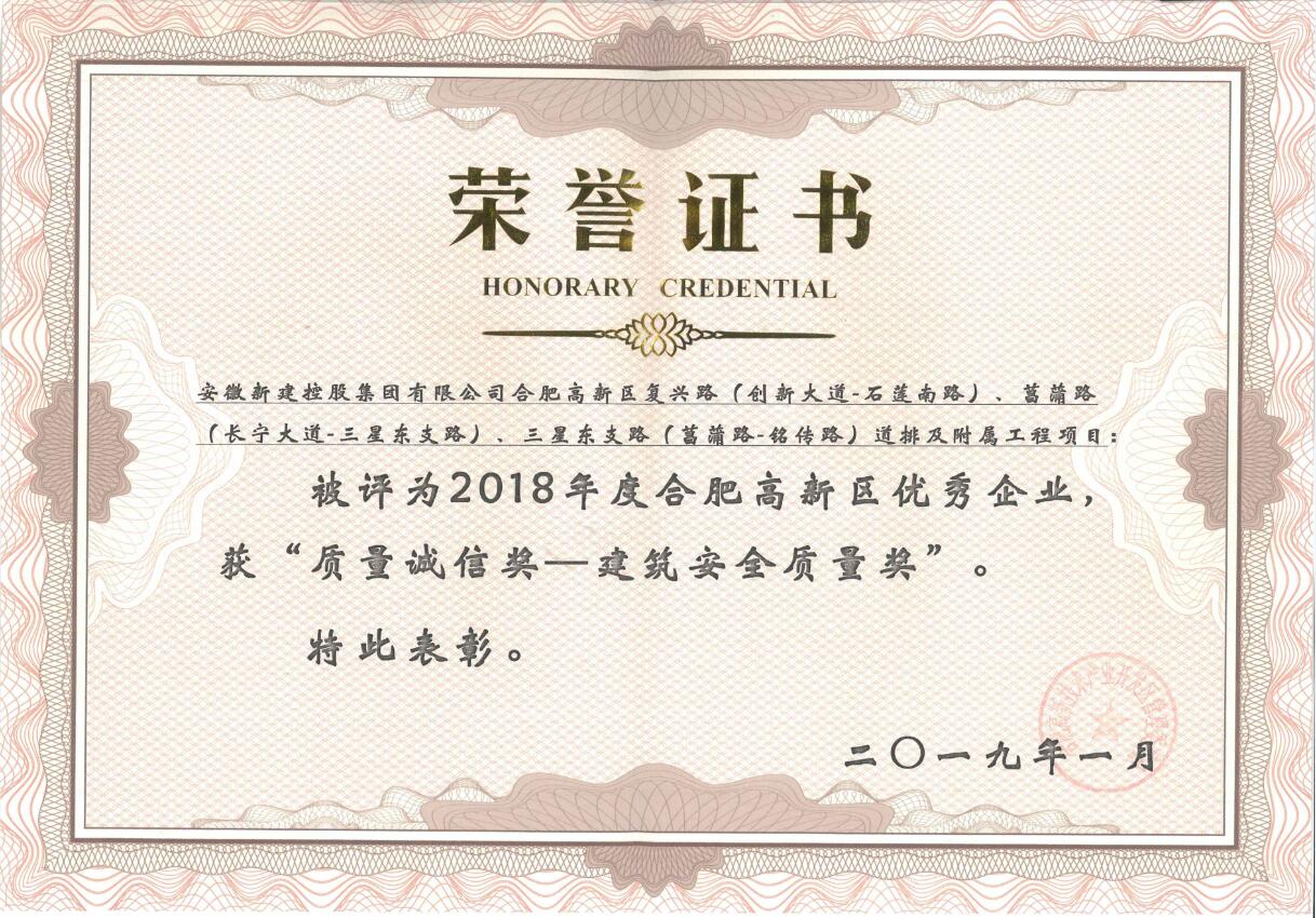 喜報,由我公司承建的合肥高新區(qū)復(fù)興路(石蓮南路-創(chuàng)新大道)、菖蒲路(長寧大道-三星東支路)、三星東支路(菖蒲路-銘傳路)道排及附屬工程榮獲“質(zhì)量誠信獎——建筑安全質(zhì)量獎”,同時,我公司被評為2018年度合肥高新區(qū)優(yōu)秀企業(yè)。這是本項目繼“廬州杯”和“合肥市市政工程安全文明標(biāo)準(zhǔn)化示范工地”之后獲得的又一殊榮。