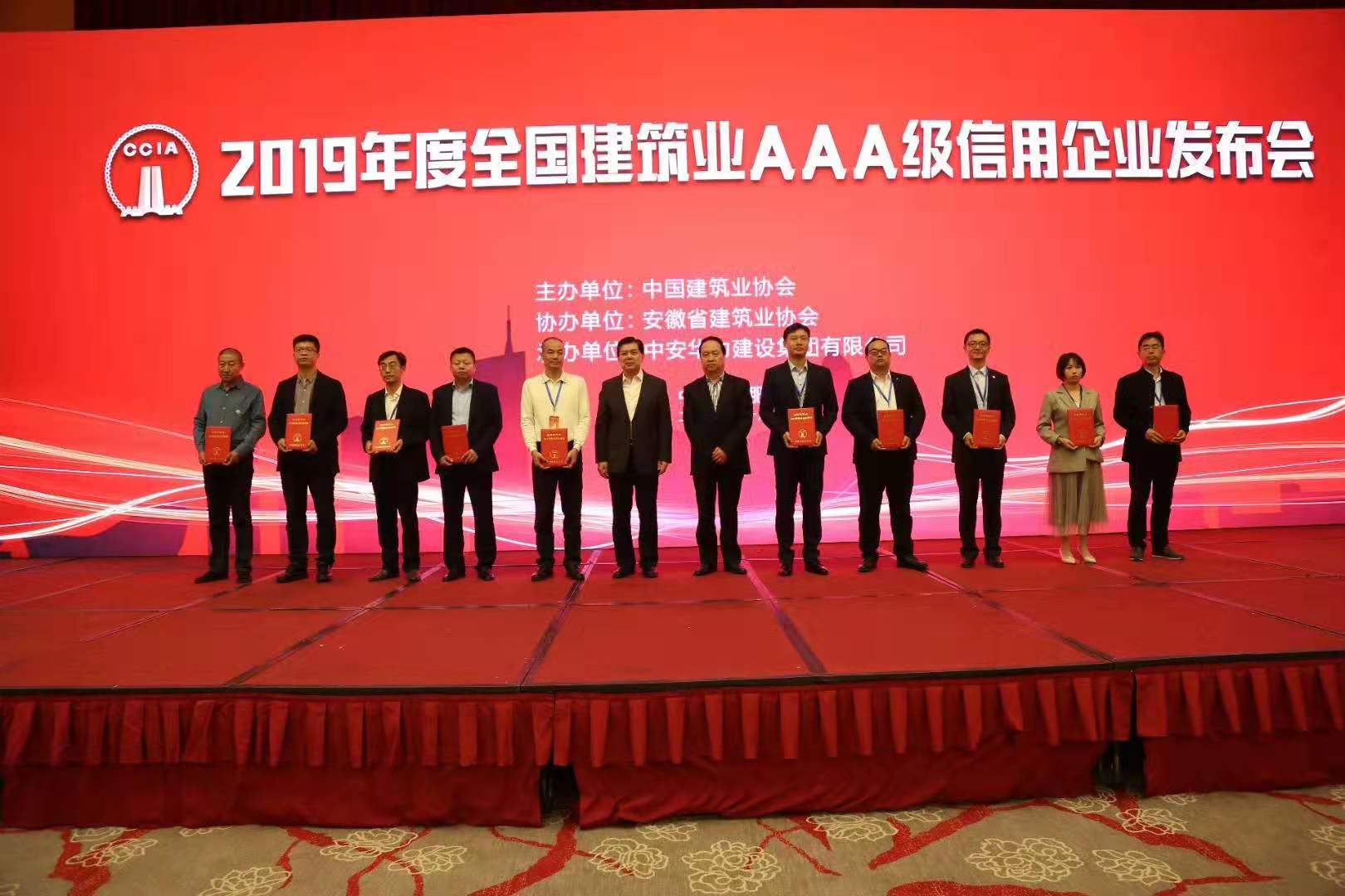 2019年10月31日,由中國建筑業(yè)協(xié)會主辦、安徽省建筑業(yè)協(xié)會協(xié)辦的2019年度全國建筑業(yè)AAA級信用企業(yè)發(fā)布會在合肥濱湖世紀金源大飯店圓滿召開,我公司憑借良好的企業(yè)信譽和優(yōu)質(zhì)的工程質(zhì)量,在諸多施工企業(yè)中脫穎而出,獲評"全國建筑業(yè)AAA級信用企業(yè)",并作為AAA級信用企業(yè)代表上臺領(lǐng)取證書。