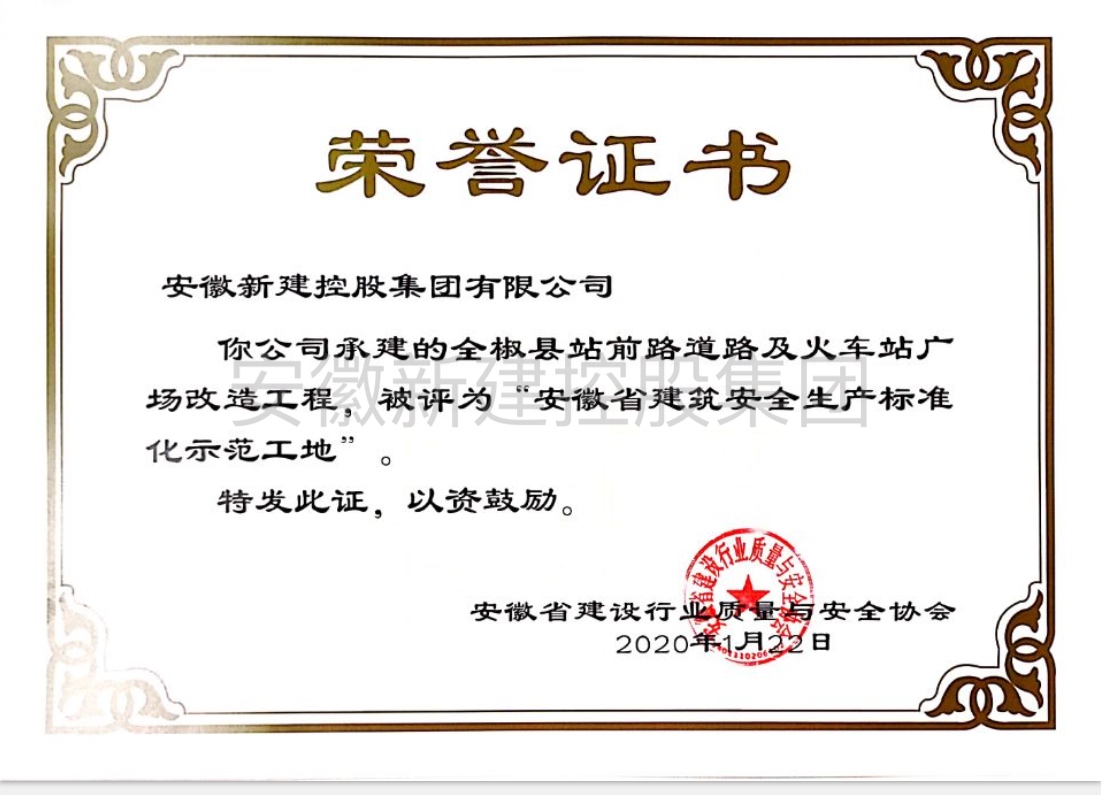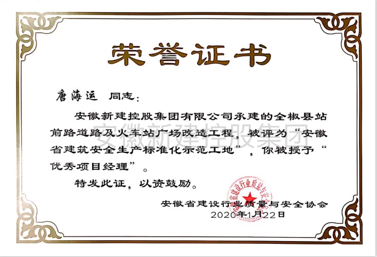 近日,我公司承建的全椒縣站前路道路及火車站廣場(chǎng)改造工程,通過安徽省建設(shè)行業(yè)質(zhì)量與安全協(xié)會(huì)的嚴(yán)格考評(píng),被評(píng)為“安徽省建筑安全生產(chǎn)標(biāo)準(zhǔn)化示范工地”稱號(hào)。唐海運(yùn)獲“優(yōu)秀項(xiàng)目經(jīng)理”稱號(hào)。